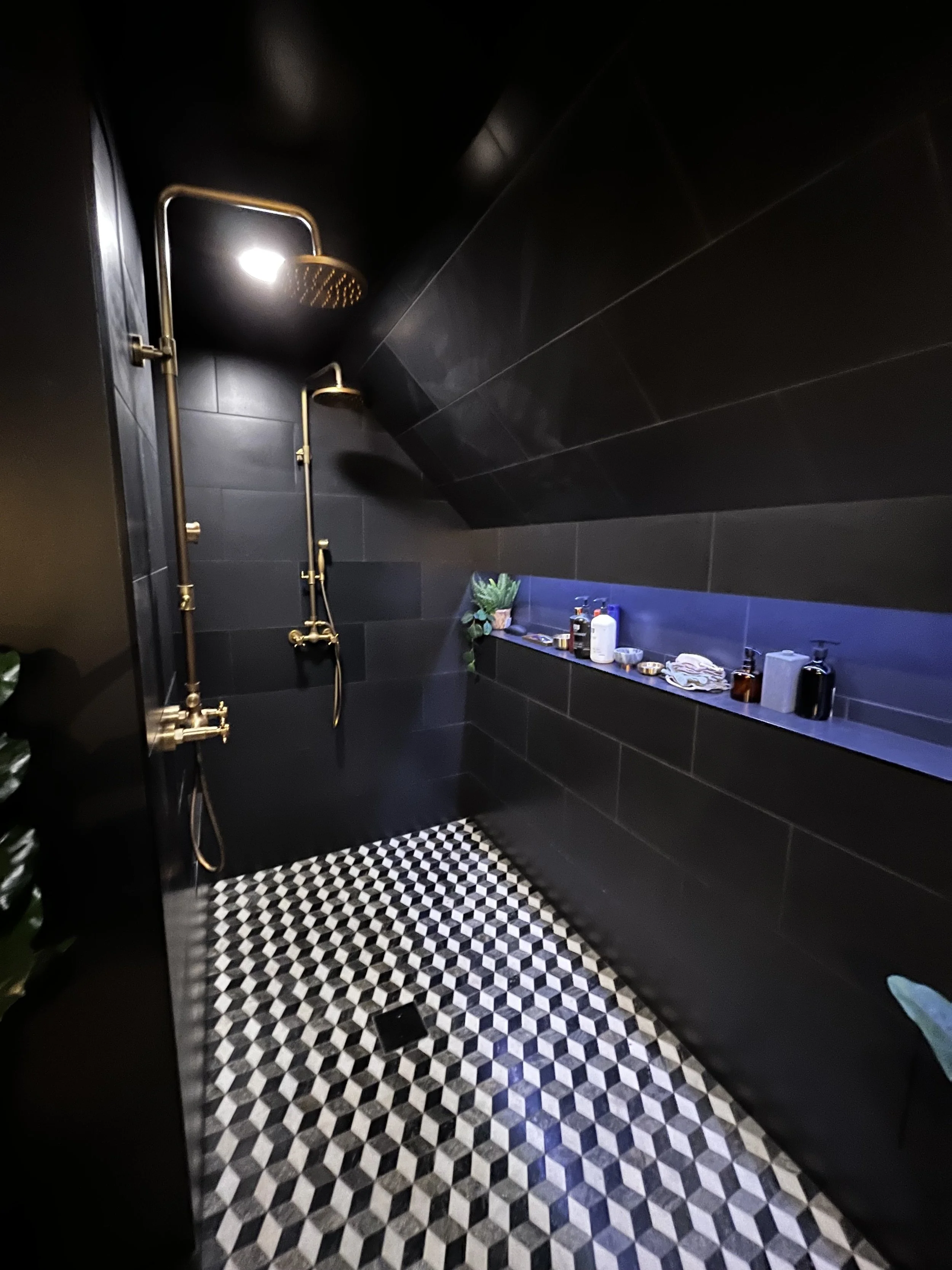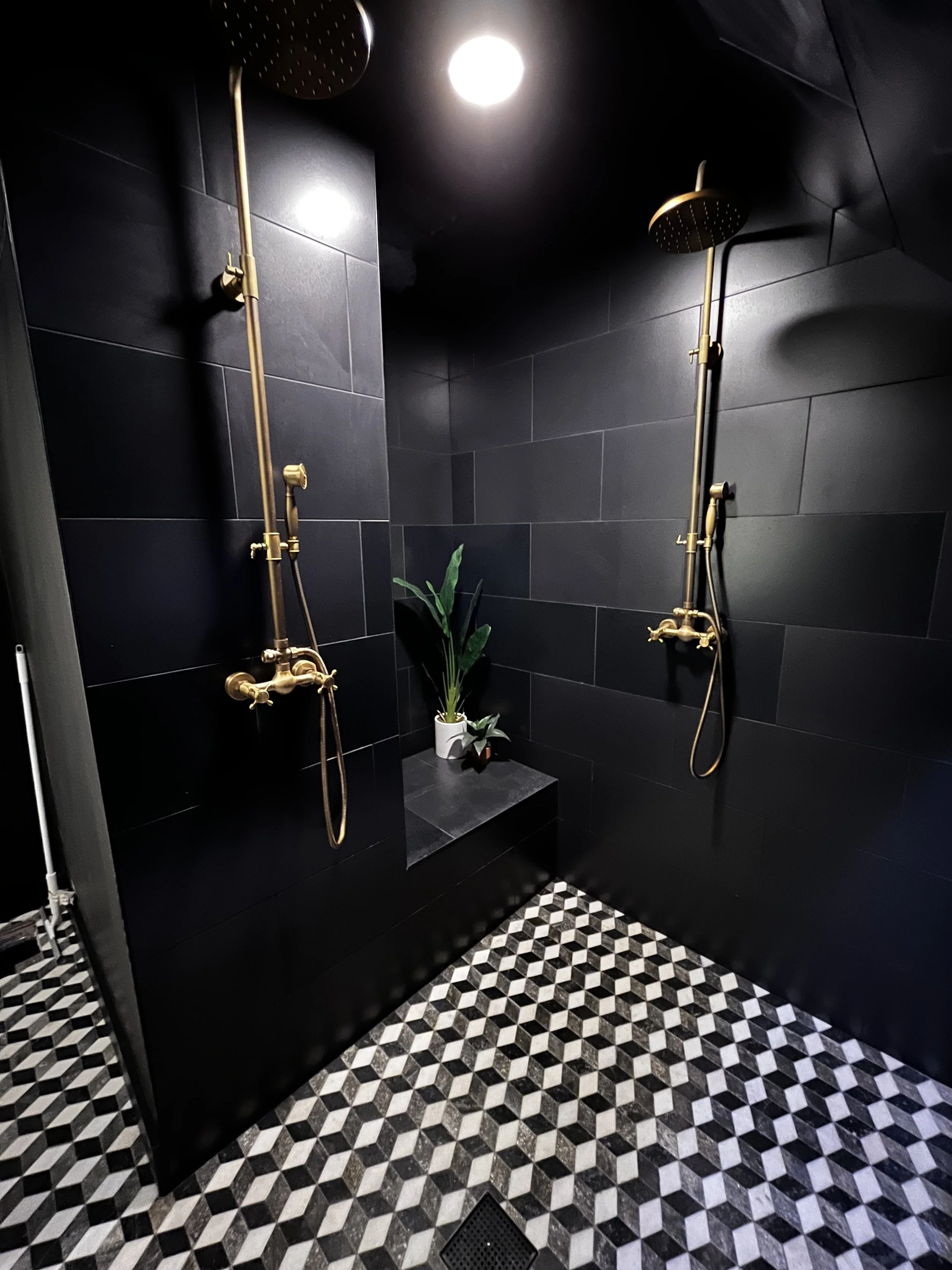Dark luxury redefined—this all-black Rogers Park bathroom is elevated with gold accents and a striking geometric slate floor.