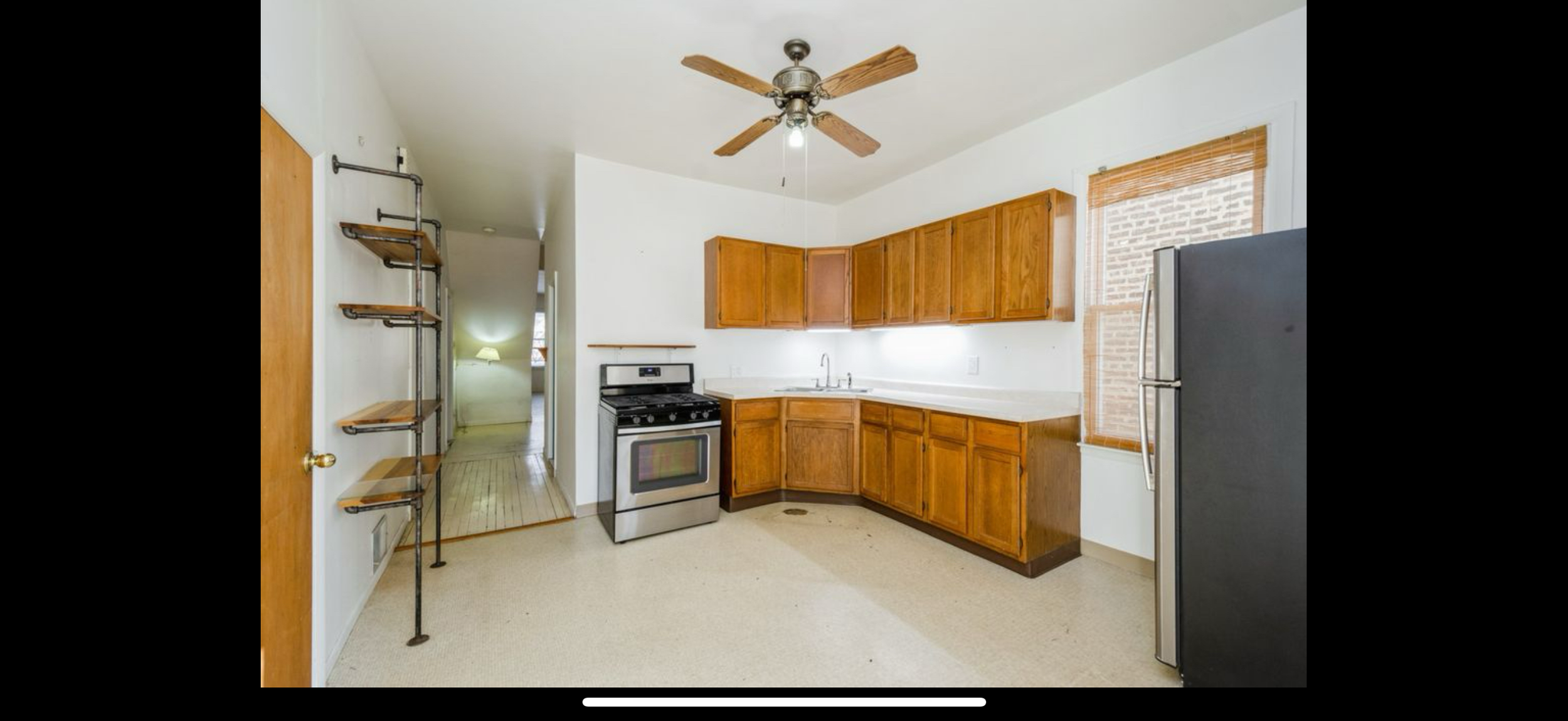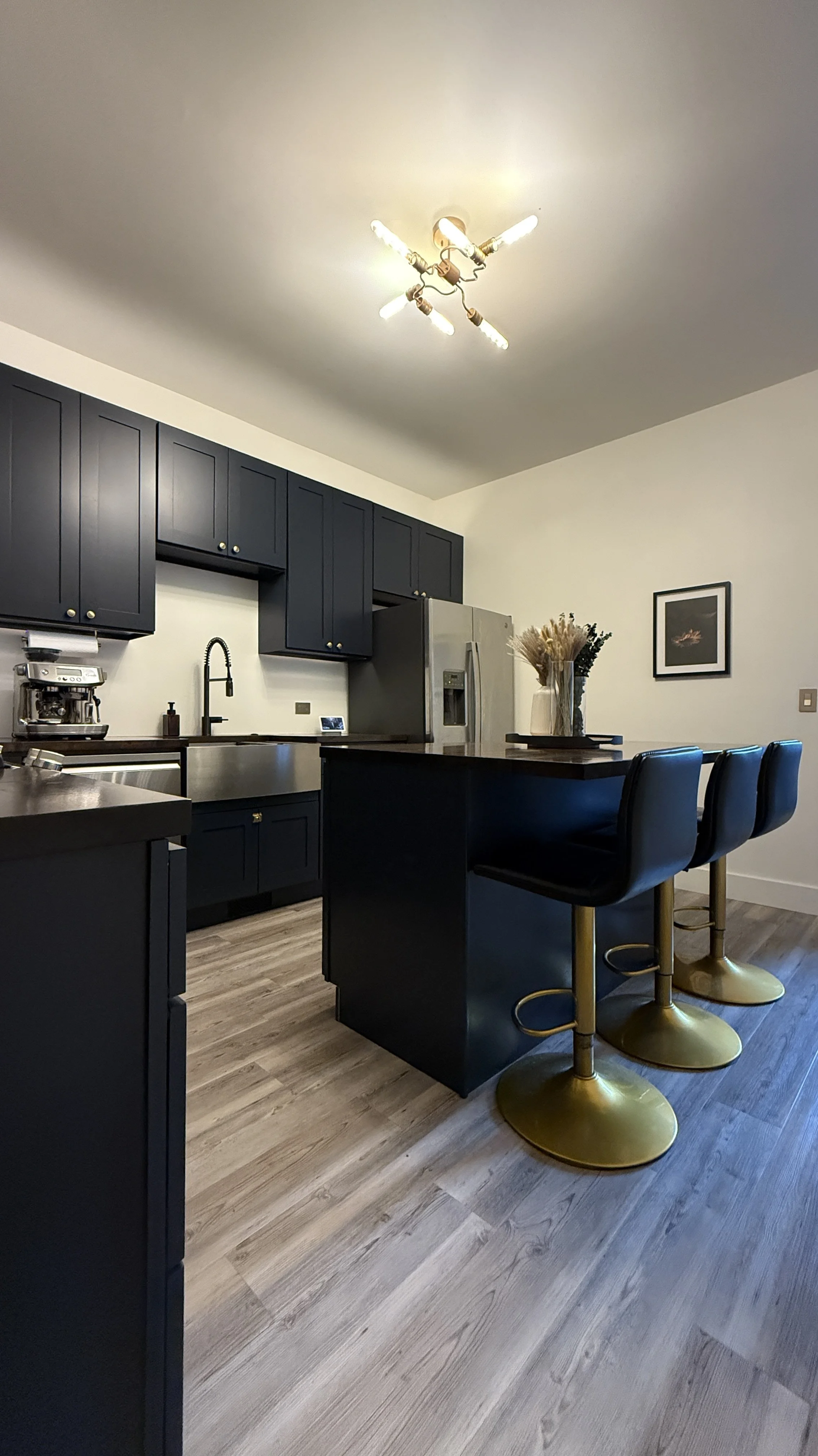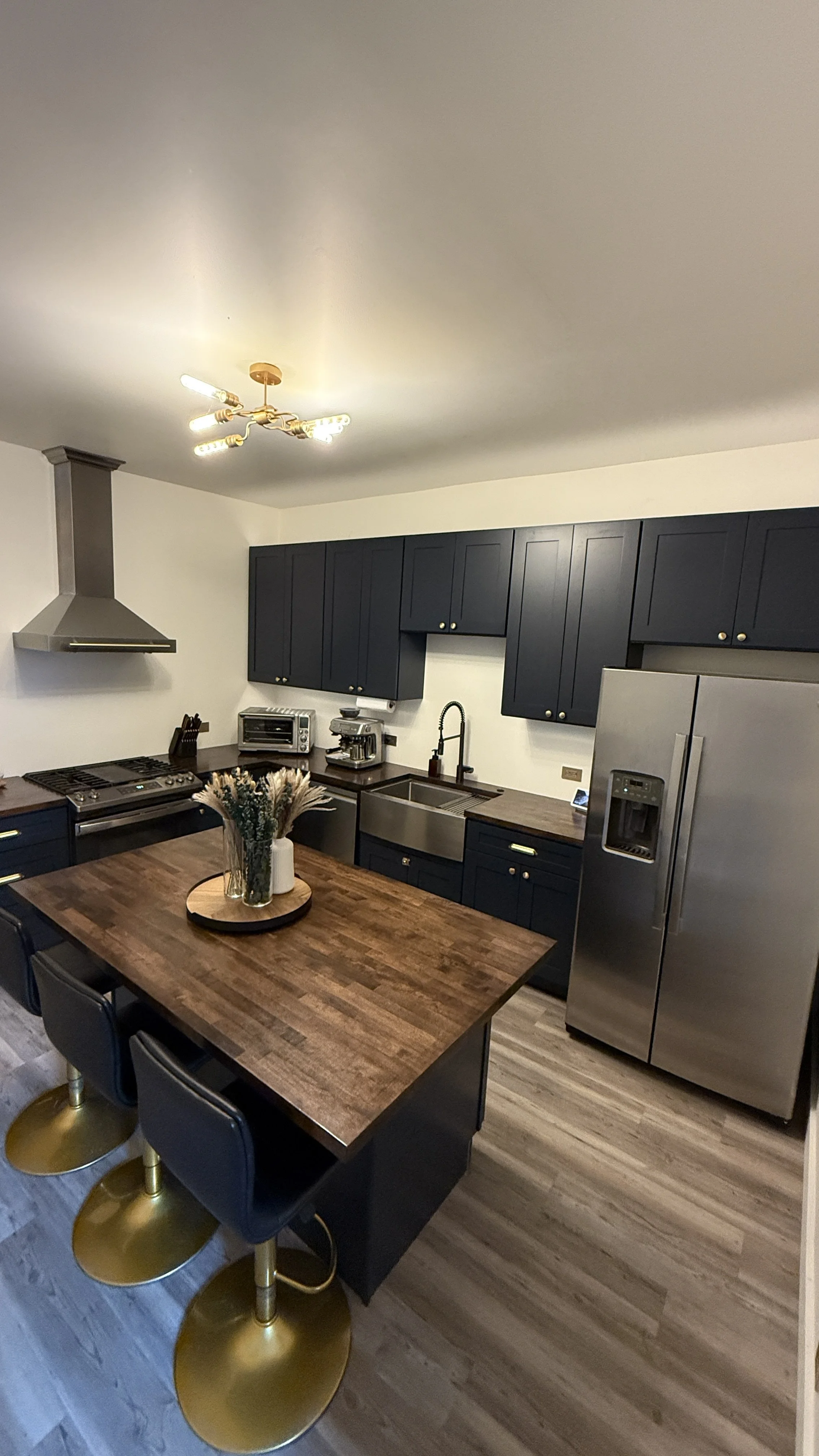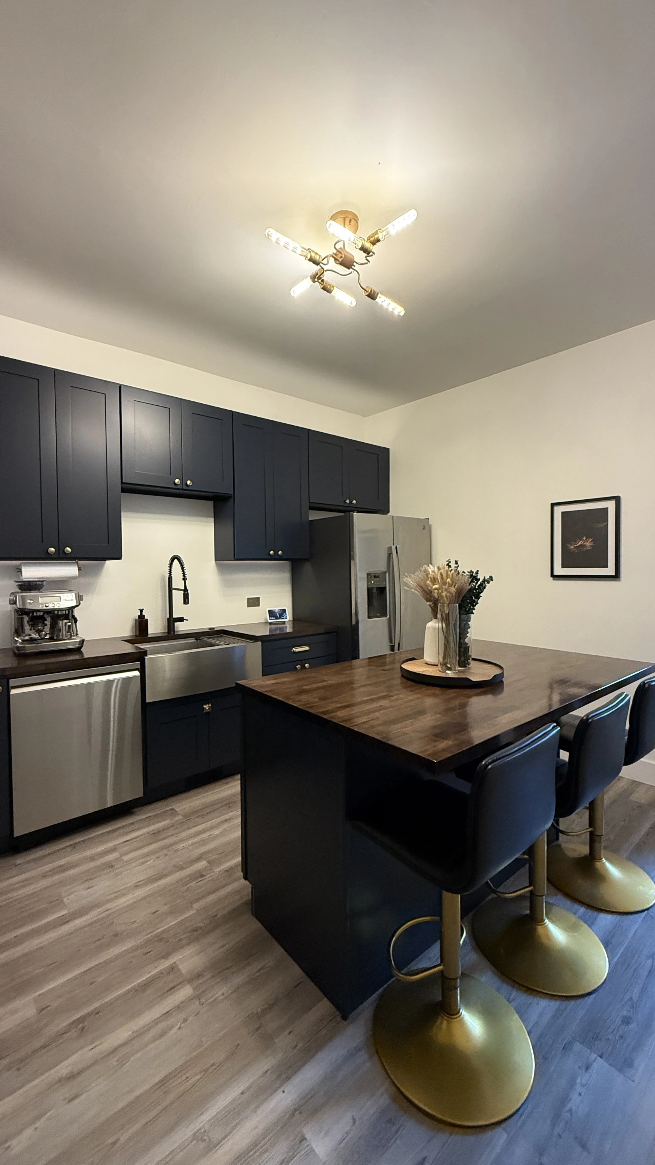 Modern sophistication in Rogers Park—navy cabinetry, gold details, and a warm butcher block counter create a kitchen designed for both beauty and function.
