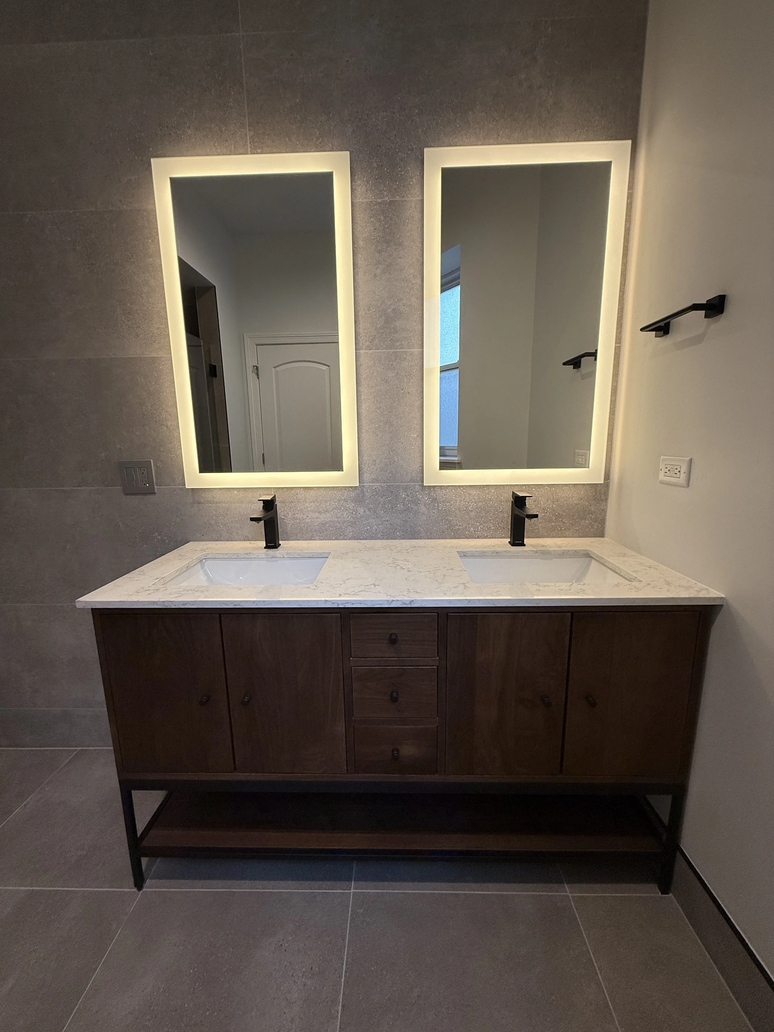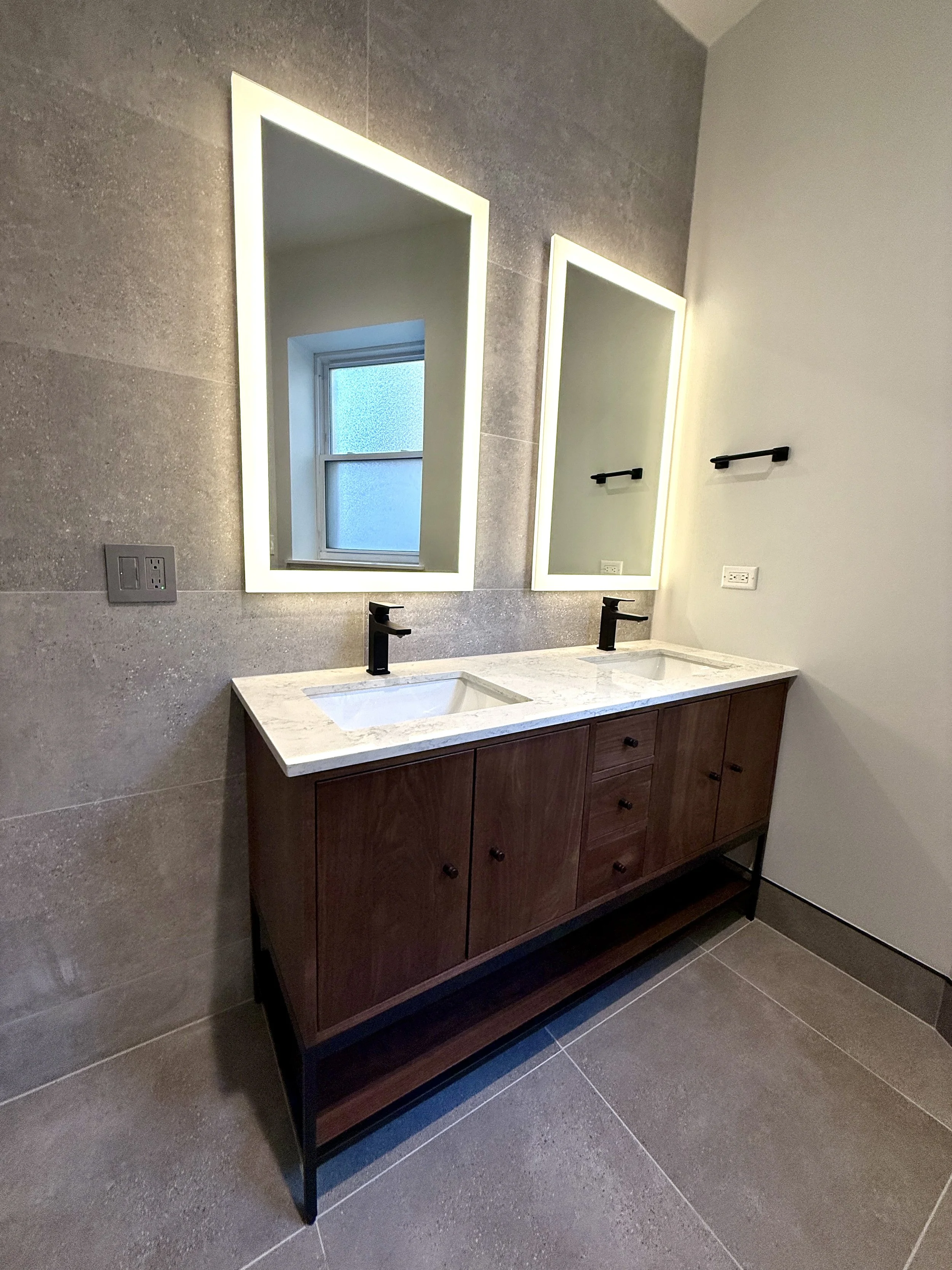 Modern comfort meets industrial edge—heated floors and LED vanity mirrors bring luxury to this earthy Uptown bathroom.