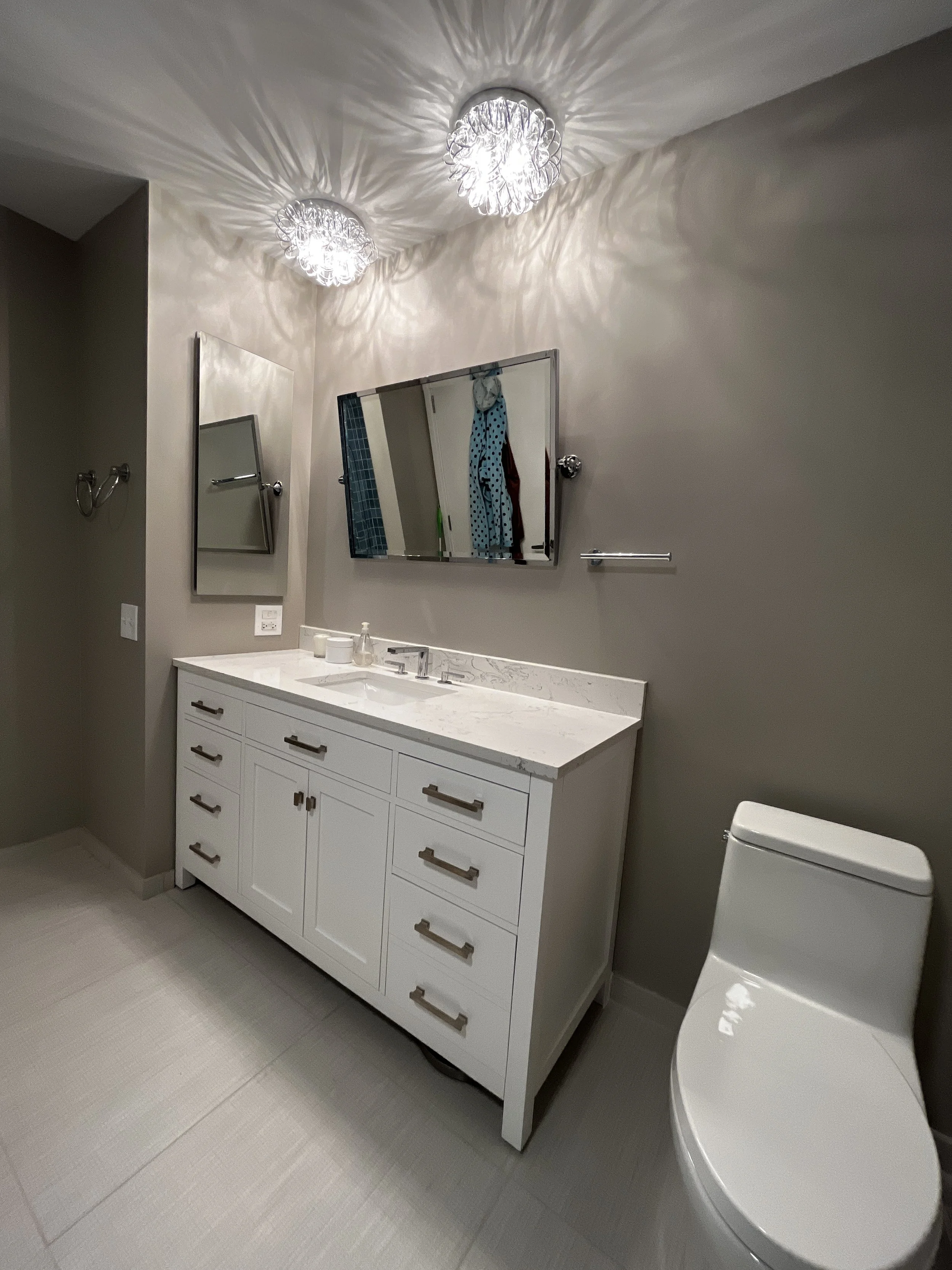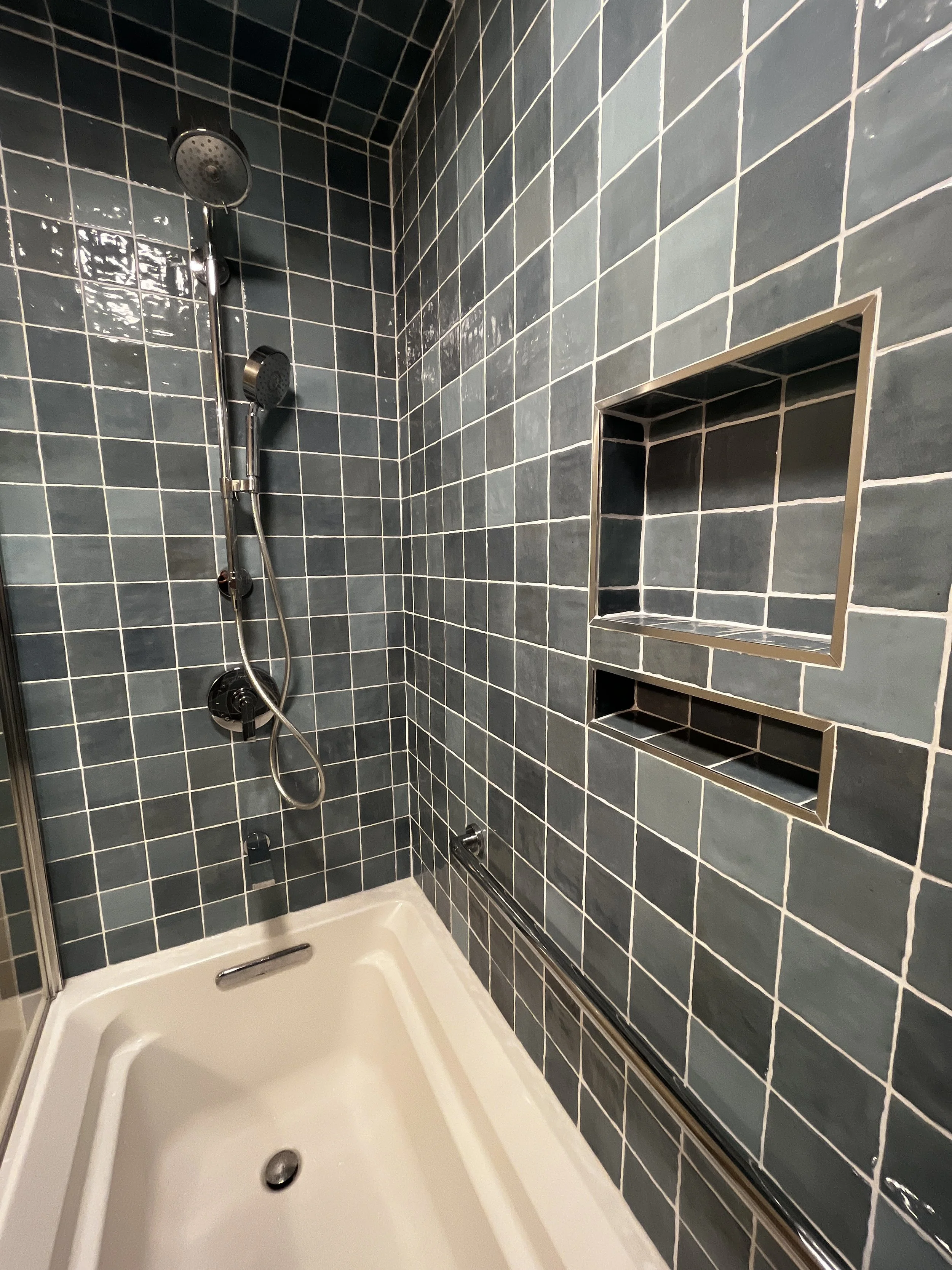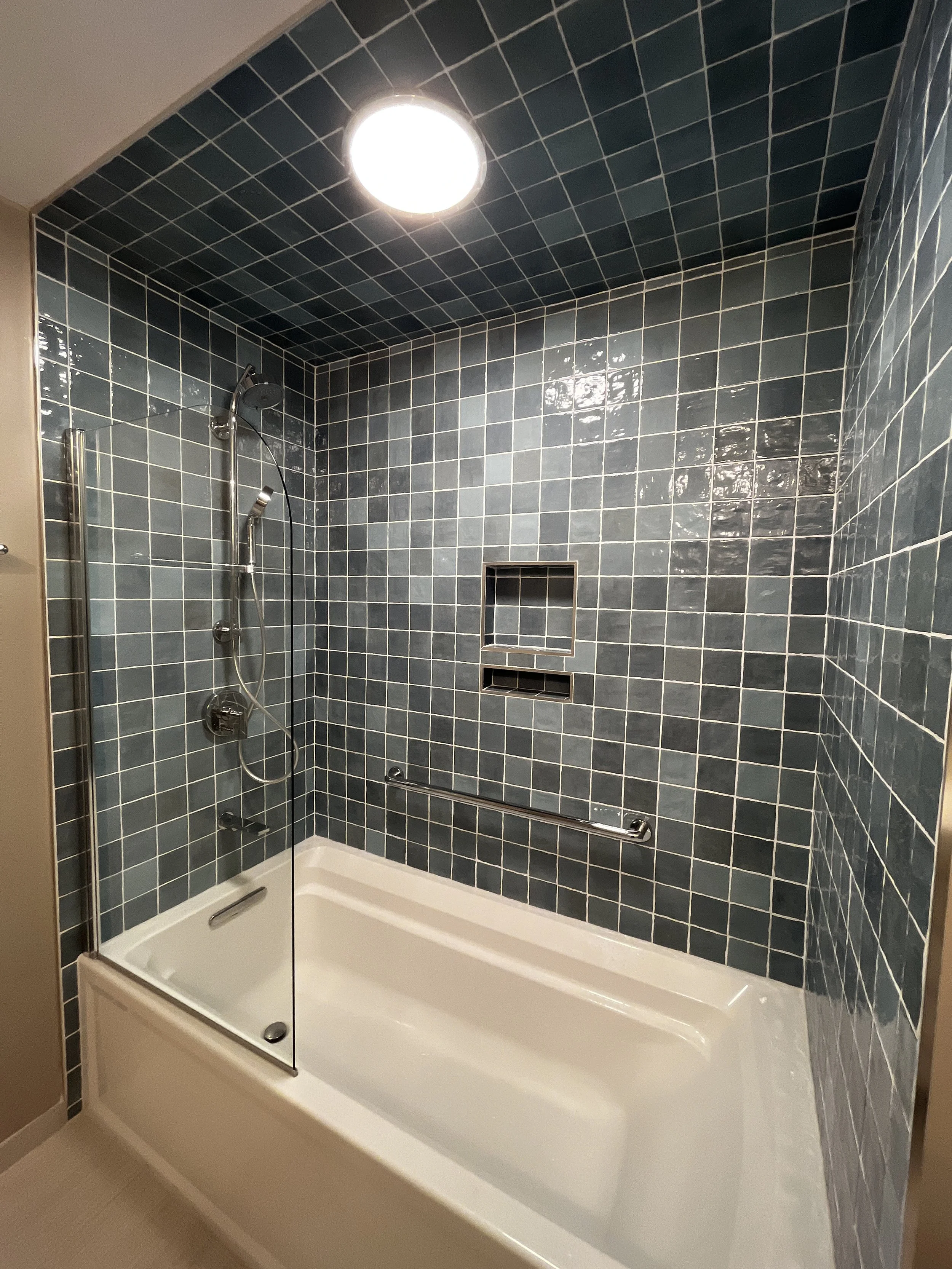 Neutral elegance with a bold twist—this Gold Coast bathroom balances timeless tones with a vibrant splash of blue tile in the shower.